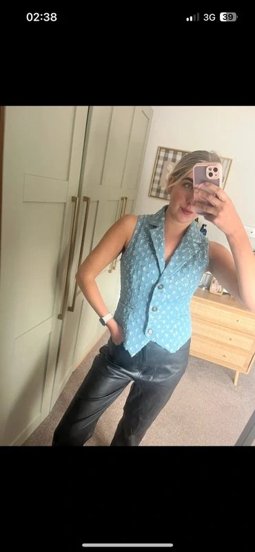 The Never Fully Dressed Light Blue Denim Waistcoat is available in sizes M.