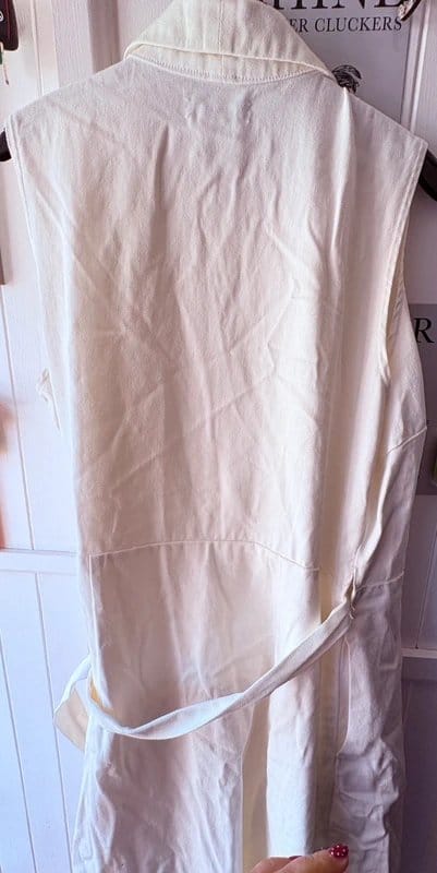 The Never Fully Dressed Sleeveless V-Neck White Denim Wrap Dress is available in sizes L.