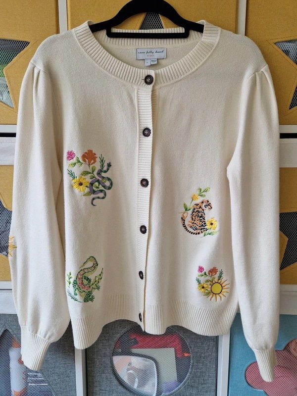 Gorgeous, super soft cream coloured cardigan with colourful mosaic inspired embroidered details. Featuring tiger, crocodile, sun, snake and floral motifs, this piece has a round neckline and button closure.