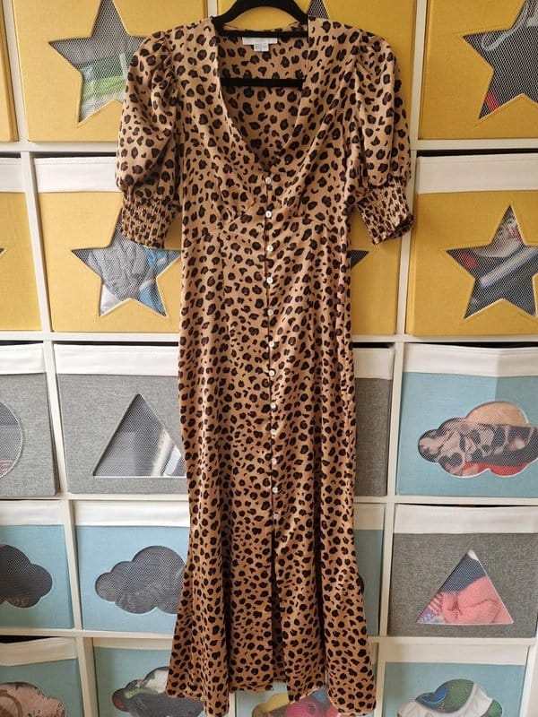 This stunning leopard print midi dress by Never Fully Dressed features a warm caramel-toned base with classic black and brown animal print throughout. Designed with a feminine V-neckline and button-through front, along with softly structured puff sleeves and a shirred waist for a flattering drape.