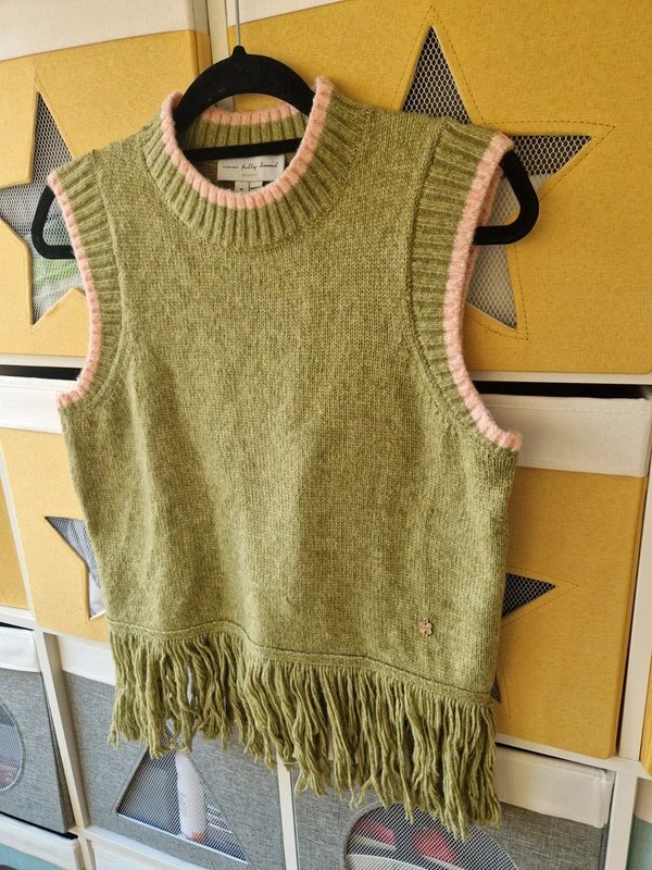 Gorgeous olive green knitted tank in a lovely light olive shade with contrast pale rose trim and fun tassel detail at the hem. Slightly cropped, boxy fit. Really soft knit. Can be worn on its own or with a shirt underneath for a chic office look.