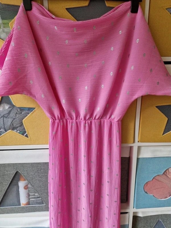 Stunning light pink Tilly dress with silver fleck detailing. Super stretchy plisse material with an elasticated waist - very comfortable to wear. Can sit as a boat neck or off the shoulder. Maxi length. Gorgeous shade of pink - pastel but not too light.