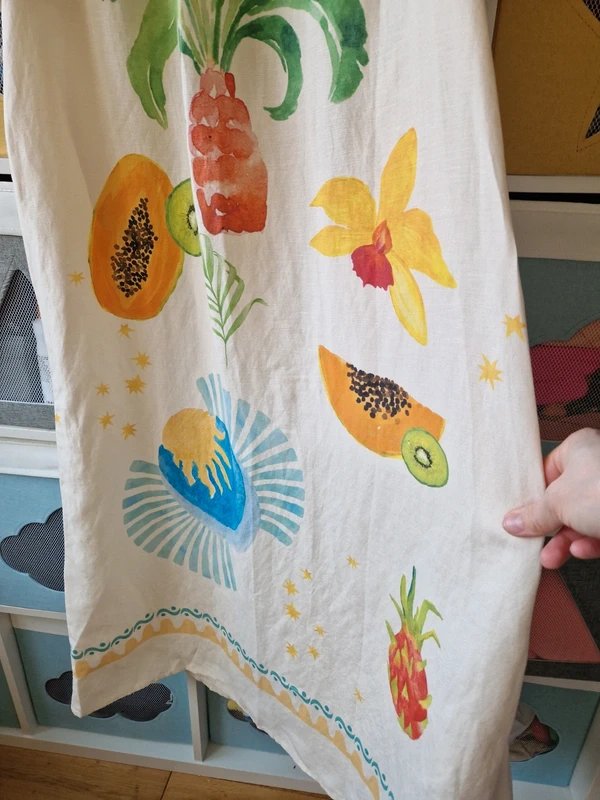 Cream Maxi Dress with hand painted motifs from our Rio print, designed in-house by our amazing design team. Features a range of tropical fruits on a cream base that transports you to the joyful atmosphere of a hot. Crafted in a beautiful, lightweight linen blend, this dress seamlessly combines comfort with style.