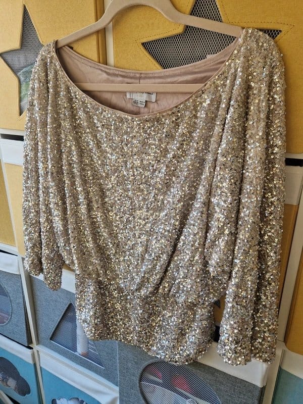 The Never Fully Dressed Silver Sequin Off-Shoulder Top is available in sizes S.