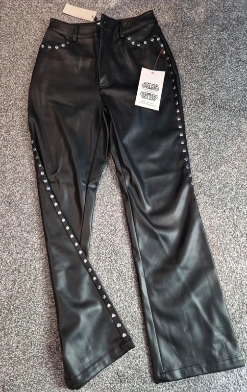 Crafted with a sleek faux leather finish, these wide-leg trousers feature riveted detailing for a bold statement piece. Perfect for evening and casual wear.