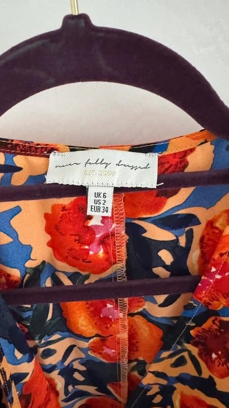 View Vinted's returns policyThis Never Fully Dressed wrap midi dress features a floral print in shades of orange and red. The lightweight fabric and ruched sleeves offer a versatile and flattering fit. Ideal for casual outings or evening events.