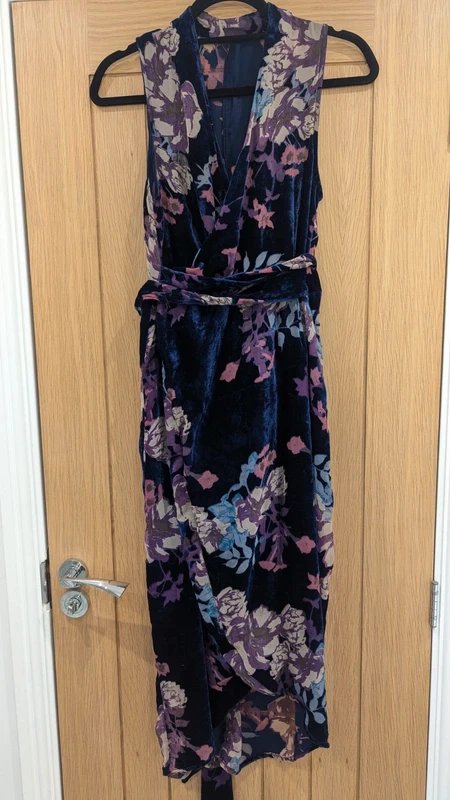 Lovely well cared for wrap dress featuring a floral pattern and velvet material. The dress has two internal securing buttons depending on how cinched you like the waist and the skirt is lined. The external wrap is held in place by the waist ties.