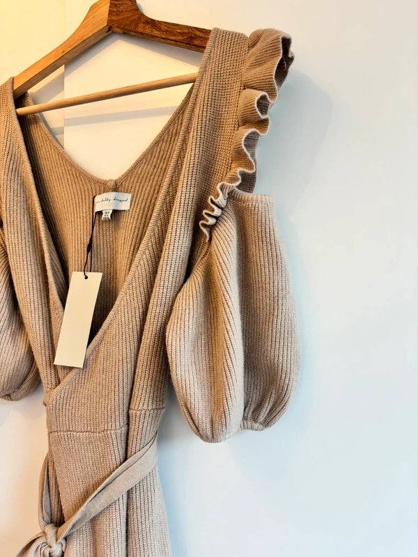 The Never Fully Dressed Wrap Knit Dress in Beige is available in sizes S.