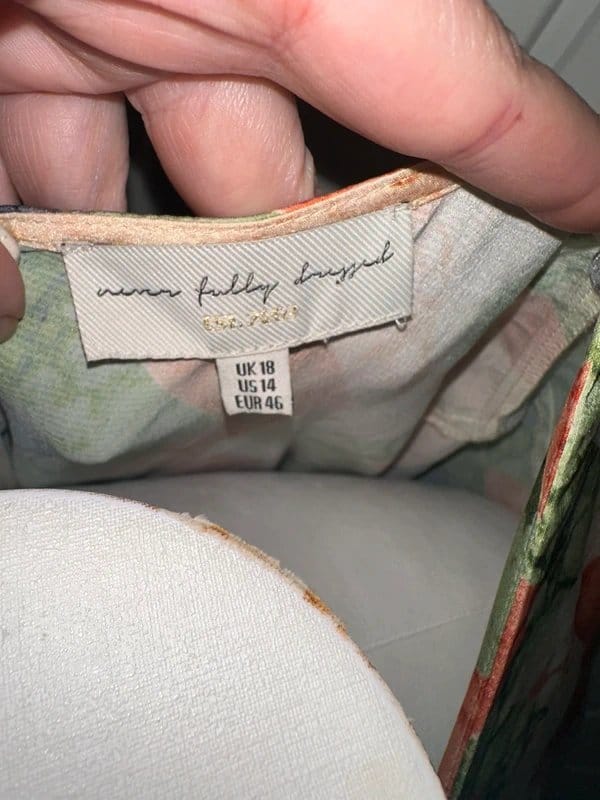 View Vinted's returns policyThis Never Fully Dressed midi dress features a zigzag pattern in a multi-colour palette. Made from satin fabric, it offers a luxurious sheen and a flattering fit. Ideal for evening events or casual outings.