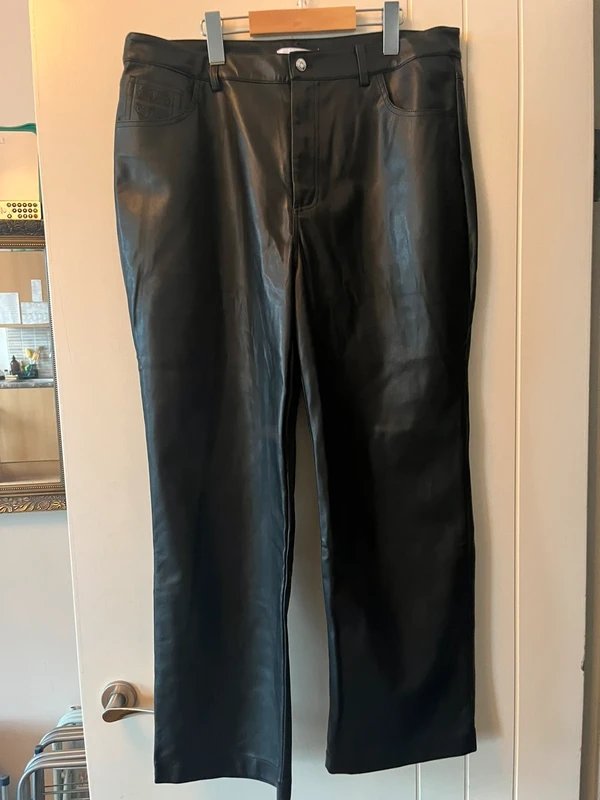 The Never Fully Dressed Vegan Leather Trousers in Black is available in sizes L.