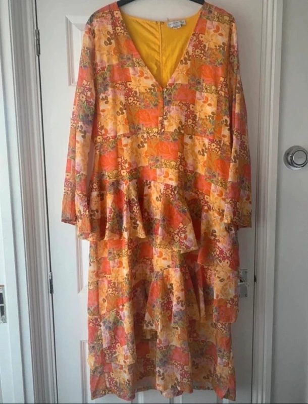 Orange Floral Chiffon Midi Dress — the must-have occasion dress for wedding guests, evening events, dinner parties. Designed in vibrant orange, this midi dress features full frill detail, a v-neckline, and a floaty silhouette for a flattering fit. Crafted from lightweight chiffon fabric with floral print, it catches the light beautifully. Includes a full-length lining for comfort and coverage.