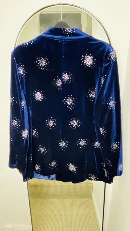 Midnight Blue Velvet Blazer with Silver Glitter Accents — the perfect addition to your evening wardrobe. Designed in midnight blue velvet, this long-sleeve blazer features silver glitter accents for a touch of sparkle. Crafted from luxurious velvet fabric, it offers a fitted silhouette and a zipper closure for a sleek look. Ideal for evening events, party occasions, and special occasions.