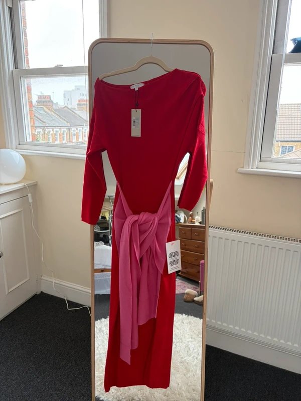 The Never Fully Dressed Pink and Red Knit Dress is available in sizes S.