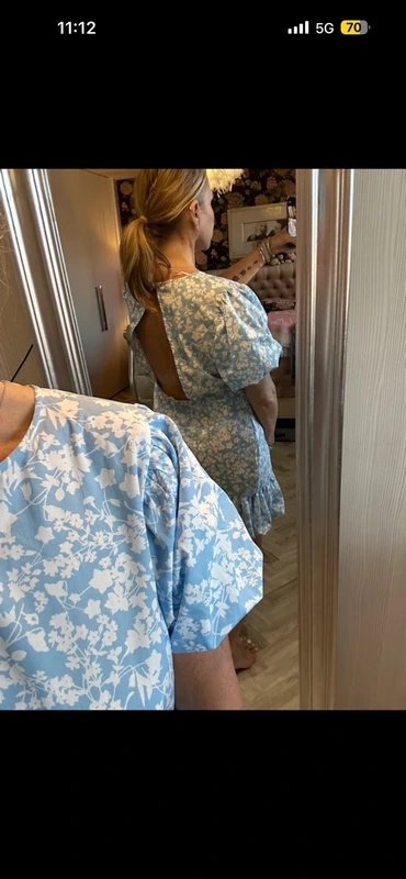 Light blue floral print dress with a flattering fit and open back. The perfect addition to your summer wardrobe. Crafted from a lightweight fabric with a subtle sheen, this dress features a boat neckline, short sleeves, and a knee-length skirt. The floral print adds a touch of femininity, making it ideal for casual outings and garden parties.
