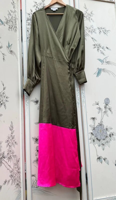 This stunning colour block dress is in a gorgeous khaki green & vibrant cerise / magenta / hot pink colourway. It is made from a satin fabric and has long balloon / blousen sleeves with a tie waist belt to cinch you in. The dress is cut to a midi / maxi length, perfect for various occasions.