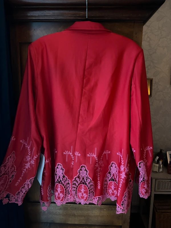 Elegant red and pink lace blazer featuring intricate designs. The embroidered details add a touch of sophistication, making it perfect for casual outings.