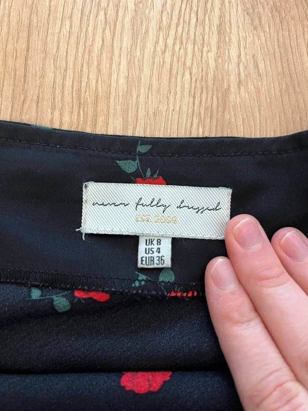 The Never Fully Dressed Satin Rose Pattern Midi Skirt is available in sizes S.