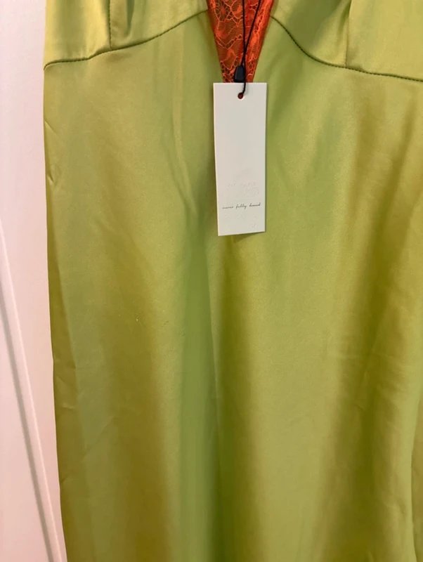Designed in lime green silk, this dress features orange lace detailing to the front. The slim fit silhouette is perfect for a variety of occasions.