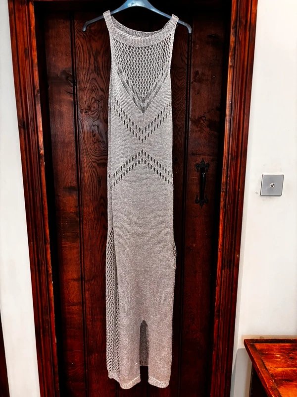 This silver metallic crochet dress features a low cut neckline, perfect for the chic beach babe. Its elegant design adds a touch of glamour to any casual occasion.