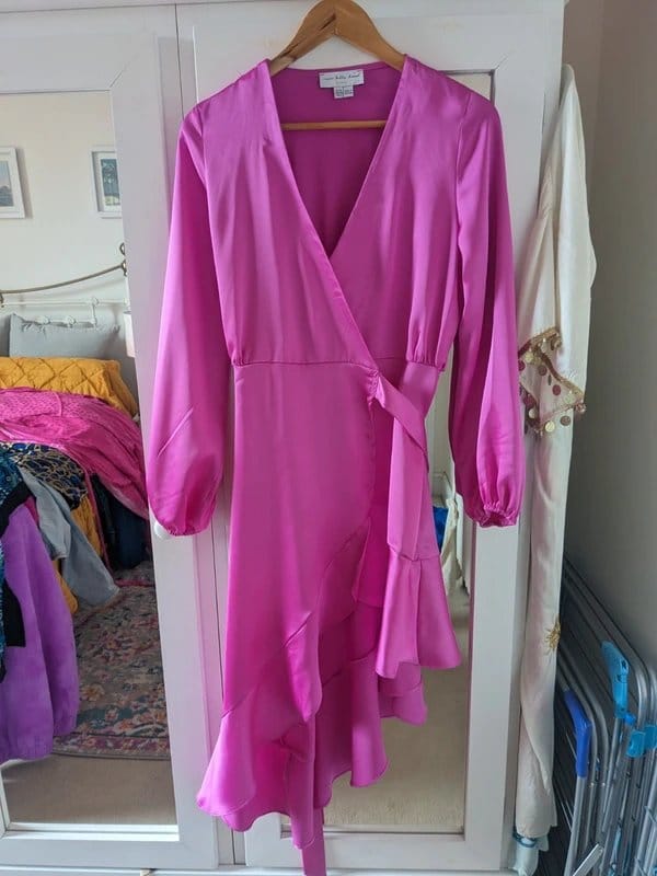 This wrap dress by Never Fully Dressed features a through tie and a frilly asymmetrical hem. Made from satin-style material, it boasts a pinky-purple colour. Ideal for evening events or special occasions.