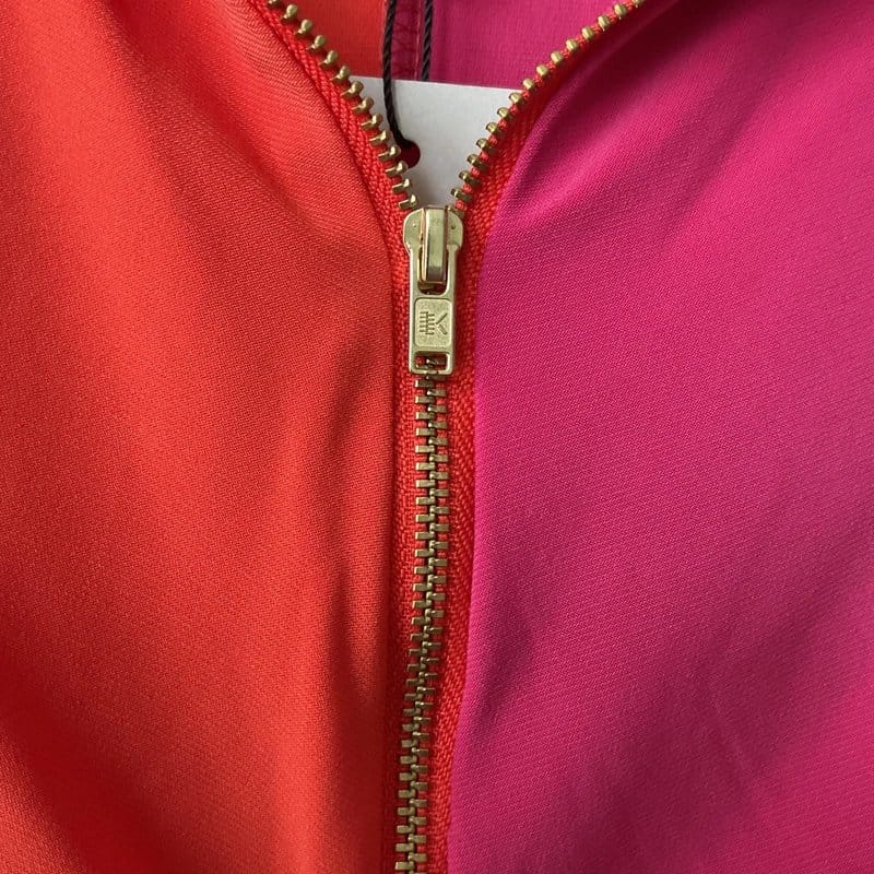 This Never Fully Dressed midi dress features a vibrant orange and pink contrast with a stylish ruched front and a full goldtone zip. The pretty collar and kick split at the back hemline add to its unique design.