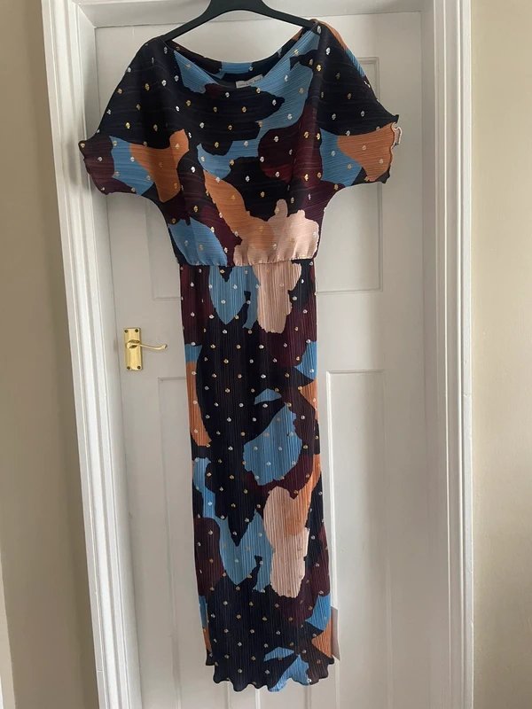 Striking metallic fleck on a chic abstract print. A fitted skirt with a slightly more voluminous top, it gives the most flattering shape. Dress down with flip flops or dress up with heels. Perfect for holidays, parties or summer weddings.
