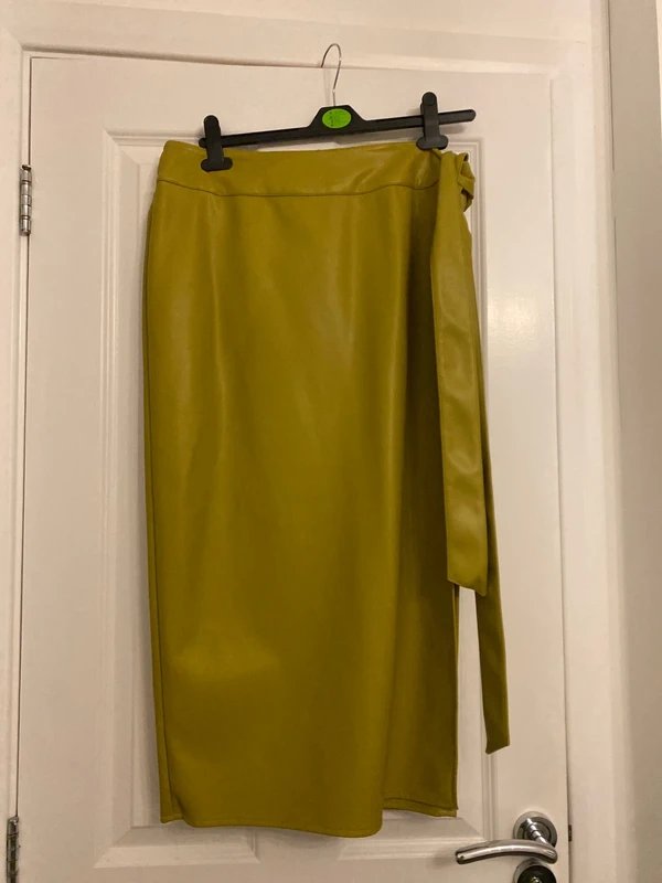 This Vegan Leather Skirt by Never Fully Dressed is a stylish addition to your wardrobe. Designed in a pencil skirt style, it features a high waist and a long length for a flattering silhouette. Crafted from faux leather, it offers a sleek and modern look. The lime green color adds a pop of vibrant color to any outfit. Perfect for casual and semi-formal occasions, this skirt is a versatile piece that can be dressed up or down.