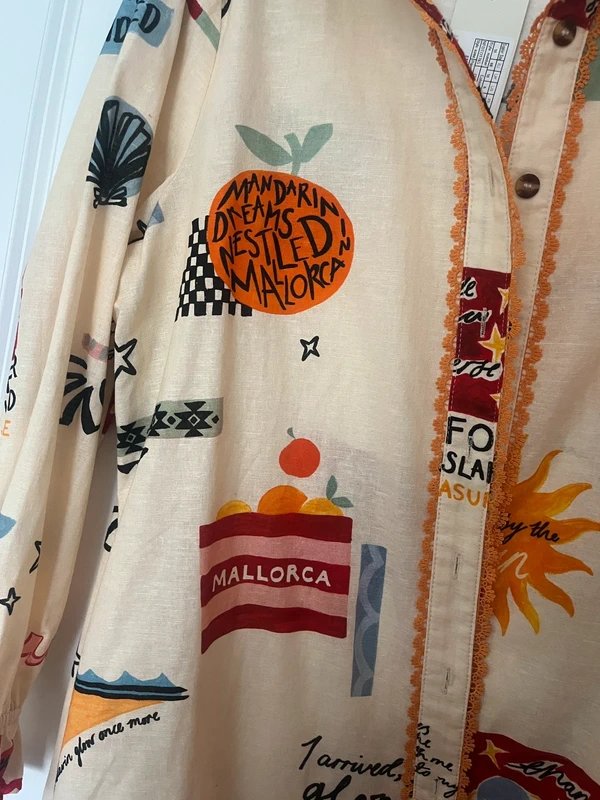 The Never Fully Dressed Poema Geanie shirt features a bold pattern across its long-sleeve cut, delivering eye-catching style with a relaxed finish. Ideal for casual wear, this shirt adds a vibrant touch to any outfit.