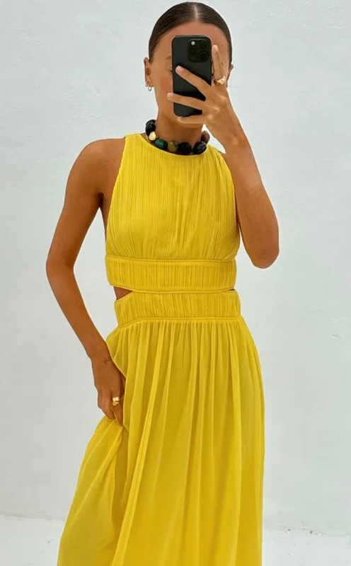The Never Fully Dressed Yellow Chiffon Maxi Dress is ideal for beach, party, evening, wedding-guest.