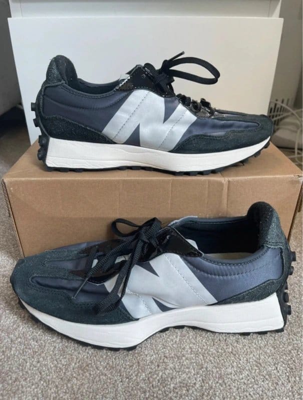 Stylish New Balance 327 trainers in a rare black, grey, and silver colourway. Features a patent leather lace area and a mesh upper for breathability. Perfect for a casual yet trendy look.