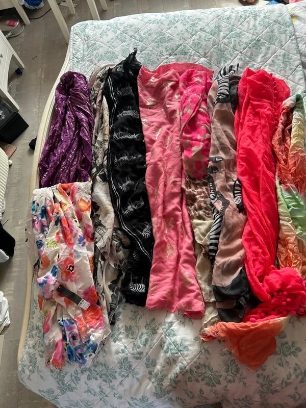 A vibrant collection of 9 chiffon scarves from New Look, showcasing a variety of styles and colours. One scarf is brand new with tags, perfect for adding a pop of colour to any outfit.