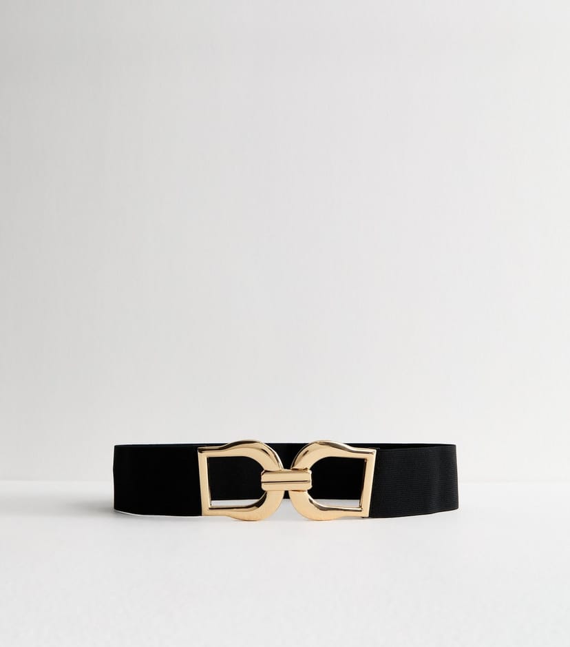 Elegant black stretchy belt from New Look with a gold buckle. Perfect for adding shape to your dresses by tucking in the waist.