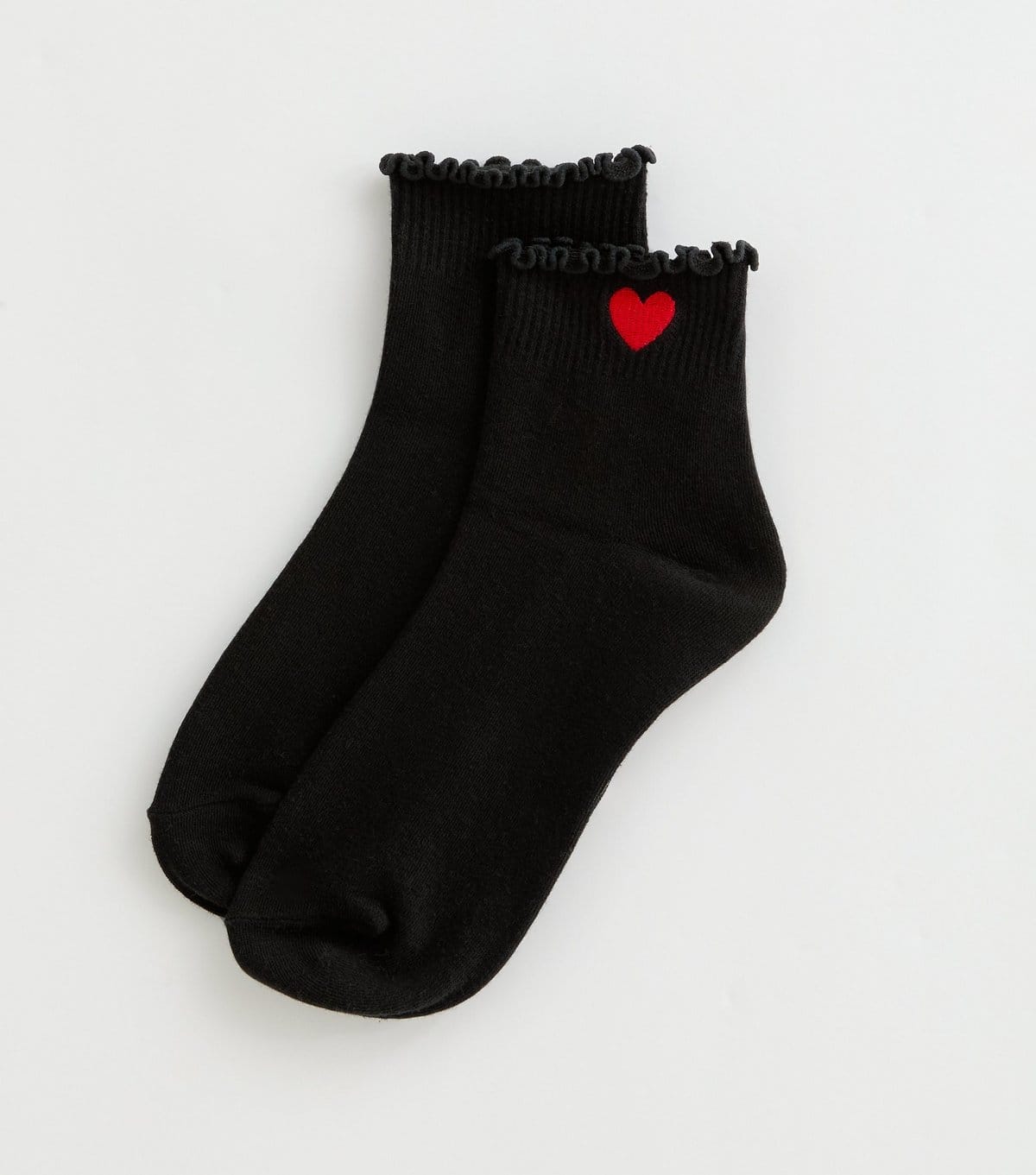 Charming black ankle socks with a red heart embroidery and frilly hem. Perfect for adding a touch of girly charm to any outfit.