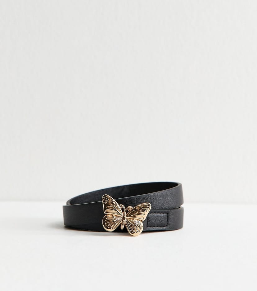 Stylish black faux leather belt from New Look. Features a butterfly buckle for a touch of elegance. Ideal for cinching in your waist and adding a chic detail to any outfit.