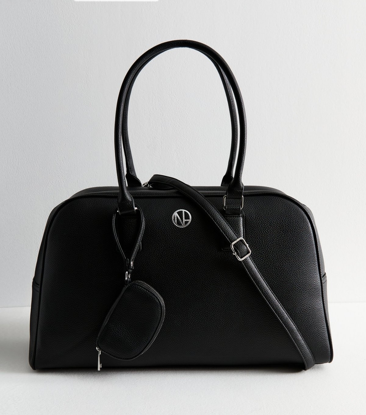A stylish black faux leather weekend bag from New Look. It features multiple carry options and an external zipped pouch for essentials. Perfect for travel and everyday use.