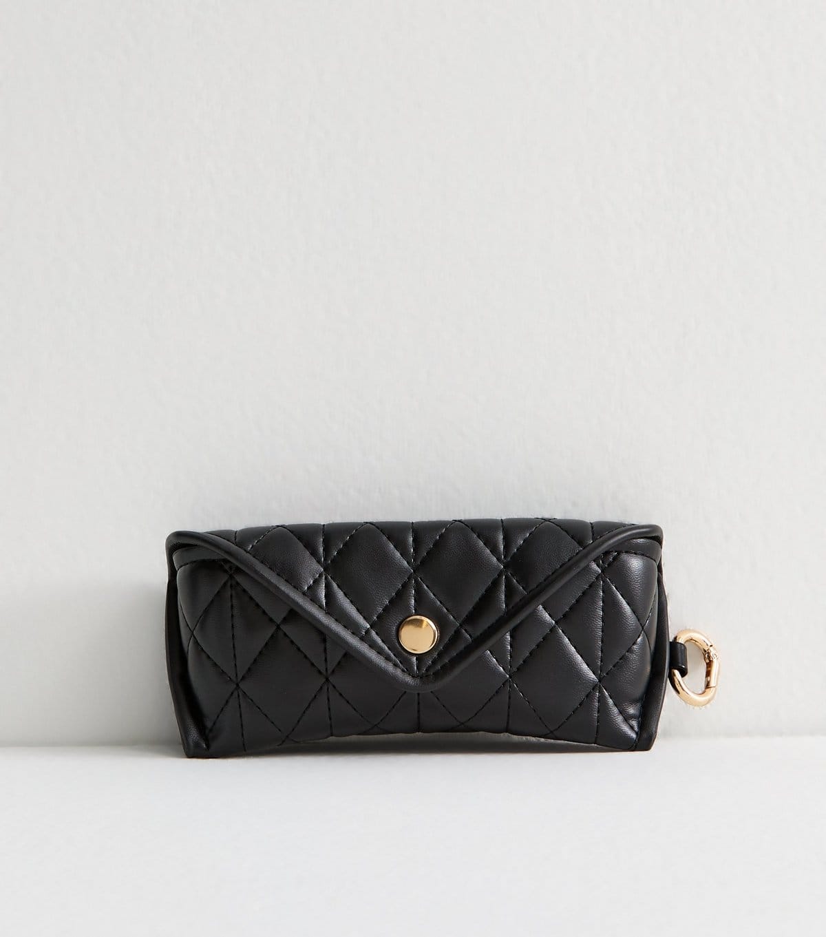 Stylish black faux leather sunglasses case with a quilted exterior and gold-tone hardware. Features a clip fastening for easy attachment to belt loops or bag straps.