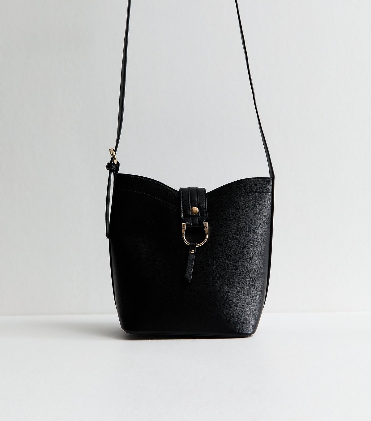 Stylish black faux leather mini bucket bag from New Look. Features a ring detail and a long strap for versatile cross-body styling. Ideal for everyday use.