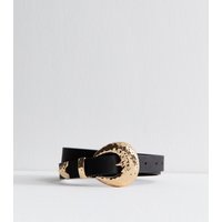 Stylish black faux leather belt with a hammered gold-tone buckle. A perfect accessory to elevate any casual outfit.
