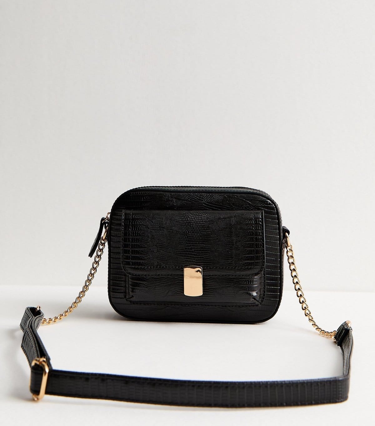 Sleek black faux leather crossbody bag with a textured finish. Features a gold-tone hardware and a chain strap. Ideal for daily outings.