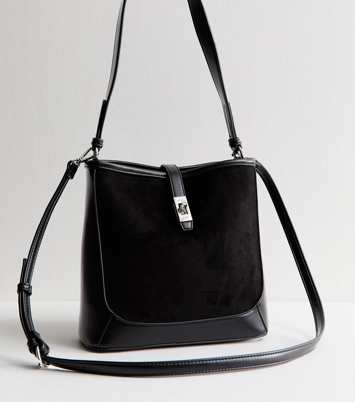 Stylish black faux suede bucket bag from New Look. Features a removable crossbody strap and silver-tone hardware. Perfect for everyday use with its practical size.