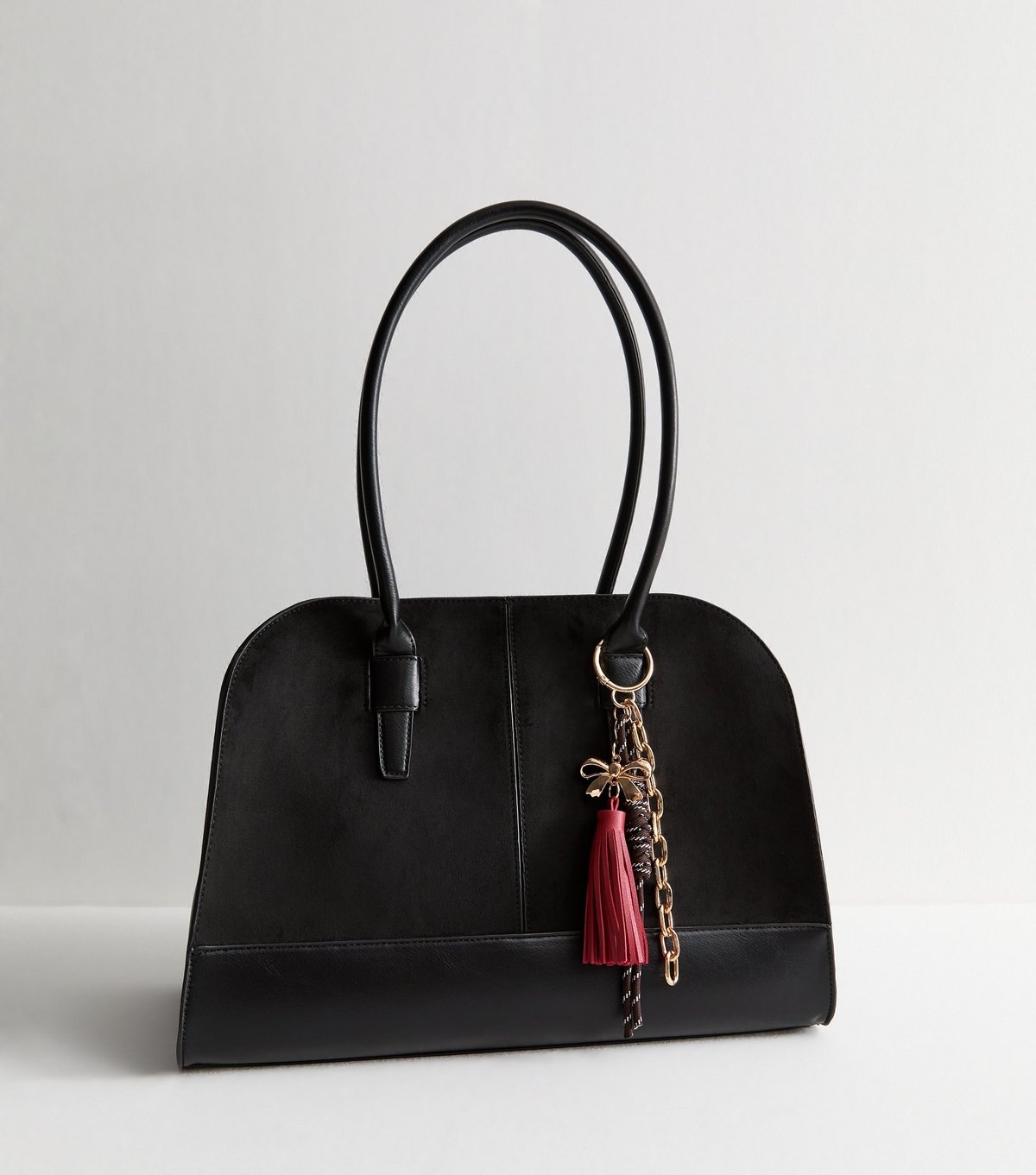 Effortlessly sophisticated with its sleek kettle shape, this black faux suede bag hangs from elongated curved handles. It features dangling keyring charms for a touch of flair. Perfect for everyday elegance.