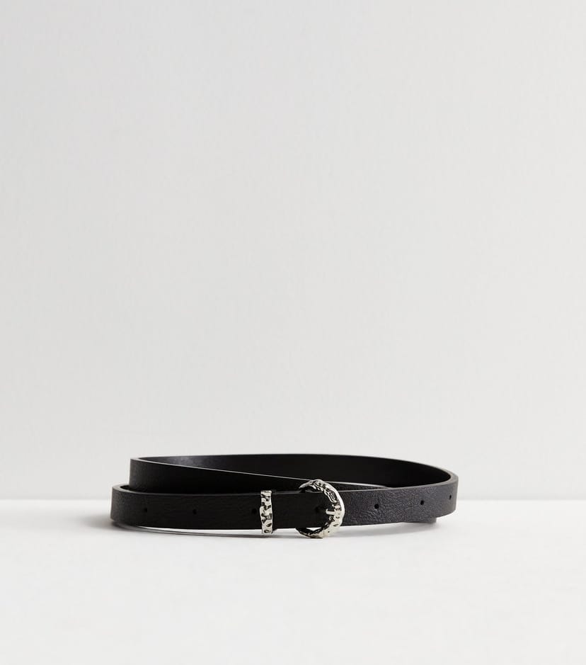 View New Look UK's returns policyThis black leather-look skinny belt from New Look features a silver buckle and textured buckle. A timeless addition to your accessories collection, it's crafted from a luxe leather-look fabric to add the finishing touch to your everyday outfit.