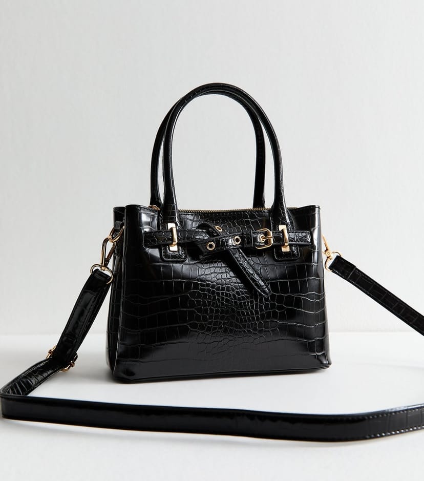 Sleek black patent faux leather mini crossbody bag with crocodile embossing and golden hardware. Perfect for daytime looks and completely vegan.
