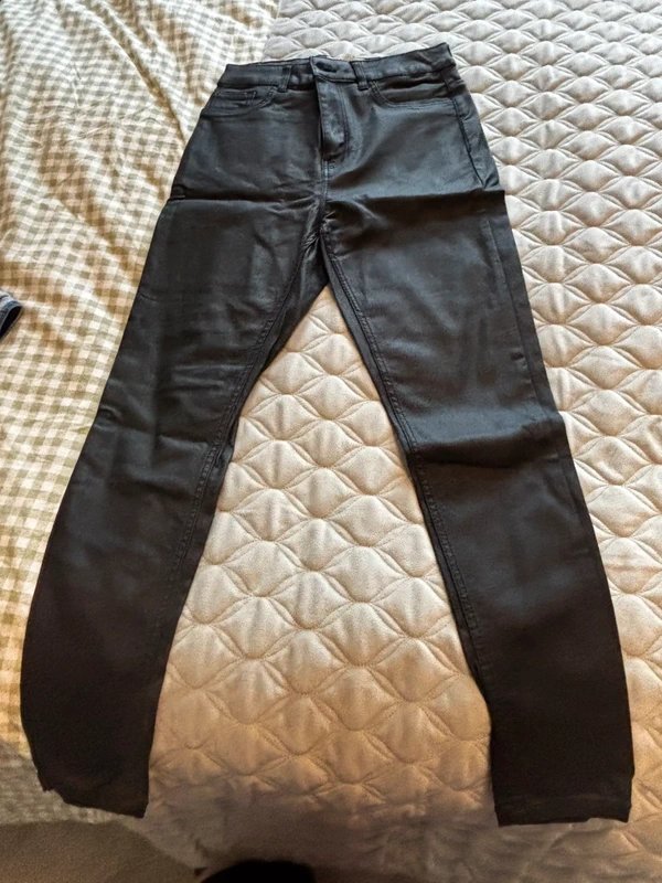 These leather look skinny jeans offer a sleek and stylish silhouette, perfect for a modern, edgy look. Crafted with a focus on fit and comfort, they're ideal for any casual setting.