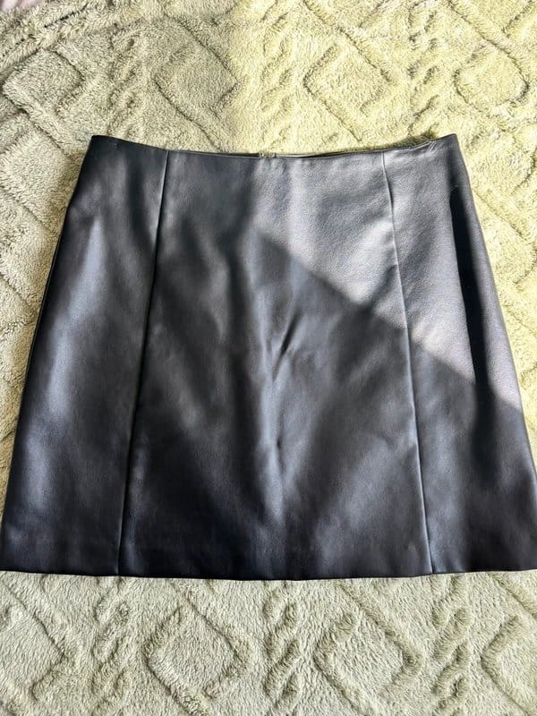 The New Look Black Leather A-Line Skirt is available in sizes M.