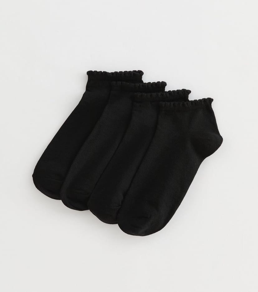 A pack of four black trainer socks from New Look. These socks feature a scalloped top edge for a unique twist on the usual low-cut style. Made from stretchy knit fabric, they are perfect for everyday wear.