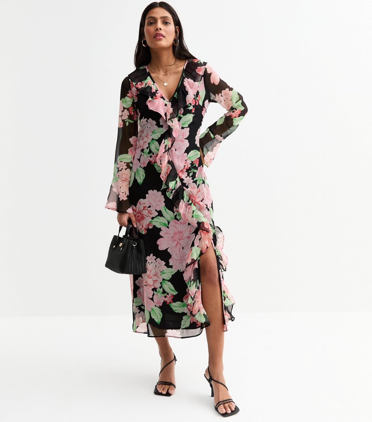 The New Look Black Floral Chiffon Midi Dress is made from chiffon.