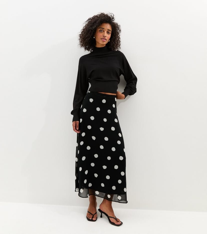 The New Look Black Polka Dot Chiffon Midi Skirt is available in sizes 10, 12, 14, 16, 6, 8.