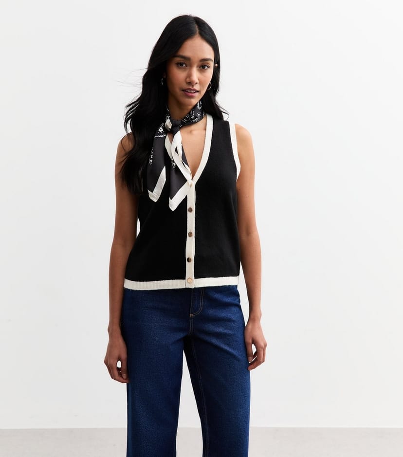 The New Look Black/White Contrast Trim Buttoned Vest is made from knitted, cotton blend.