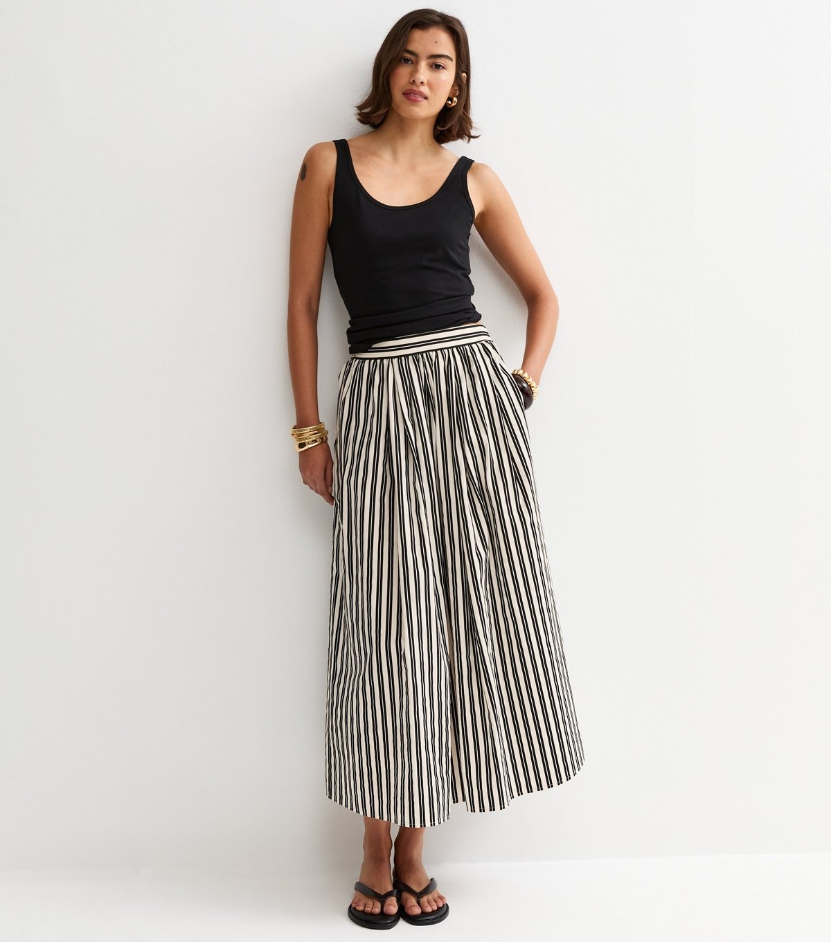 The New Look Black Cotton Poplin Striped Midi Skirt is available in sizes 10, 12, 14, 16, 18, 20, 6, 8.